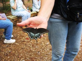 Docents Roberta and Steve Messenger introduced Ruth & John Andre to a diverse group of guests at the South Fork Nature Center on July 18th. Ruth, a butterfly expert and a retired teacher for environmental education, shared live examples of butterflies and their lifecycle and brought eggs, larvae, host plants, chrysalis, and adult butterflies such as the zebra & giant swallowtails, monarchs, fritillaries and others. We all delighted in the jewel-like beauty of the Monarch chrysalis! The live butterflies were kept cool and calm in little envelopes in an iced bag. They emerged to obligingly sit on a hand or finger for inspection, identification and admiration, before warming up and taking wing.