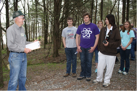 It was Tuesday, April 9, when St. Joe 10th graders, 28 of them, came to South Fork for the day. Their biology teacher, Jim Belote, had just introduced them to plants and animals in the classroom and they were anxious to be out in the woods where they could see, first hand, the ecological relationships of organisms in their environments. Organisms in an ecosystem interact with one another and their environment having some influence on the life around them: trees to trees, environment to trees, animals to animals, trees to animals, animals to environment, etc. The bus arrived at 9:00 AM, unloaded at the front stone entrance, and were welcomed by Don Culwell and Steve Smith. Don spoke of their day’s activities and the program that was planned.