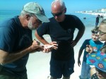 Sand dollars all broken into pieces, but one can see “petals” on the tops of the pieces where hair-like tube feet once projected to take in oxygen while other tube feet moved food particles to the mouth opening below…