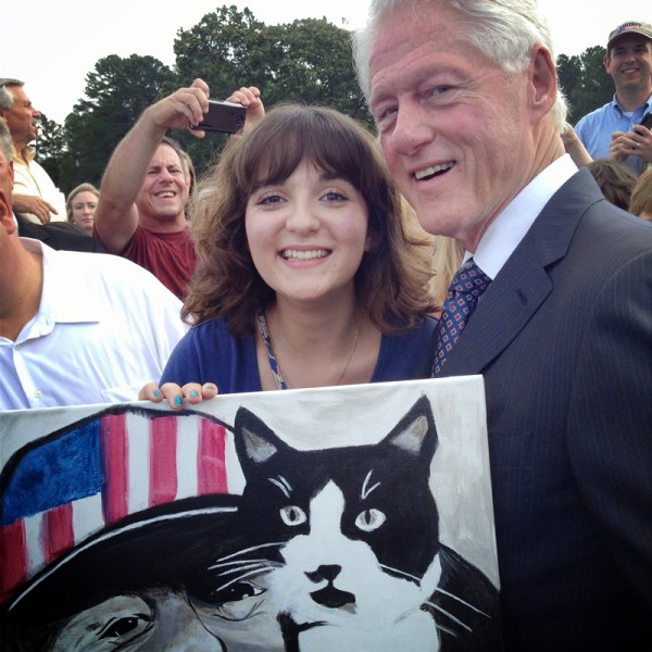Clinton resident Julia Pistole, daughter of Jeff & Maria Pistole, presents her presidential portrait to guest speaker Bill Clinton