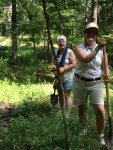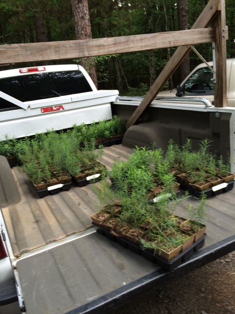 Master Gardeners in the area had been alerted of the milkweed project last fall (as had South Fork personnel); a few calls and e-mails brought folks on three days to do the planting (9 Master Gardeners and 11 South Fork folks); the job was completed in three mornings. Spade the hole, trim off the top edge of the peat pot to prevent wicking up of soil moisture, set the plant and pat in the surrounding soil, mulch with pine needles, mark each plant with an orange flag for easy location (hopefully not by some grazing deer, rabbit, or hungry, grub seeking armadillo) water with a quart cup…and 400 milkweed plants were in.