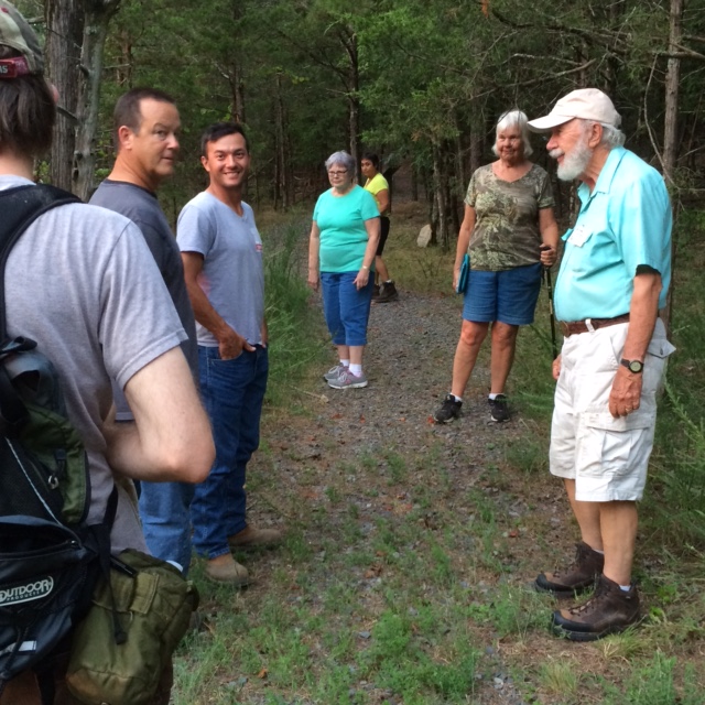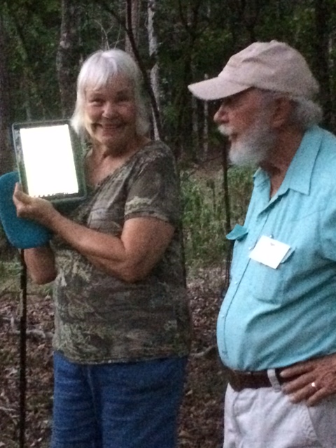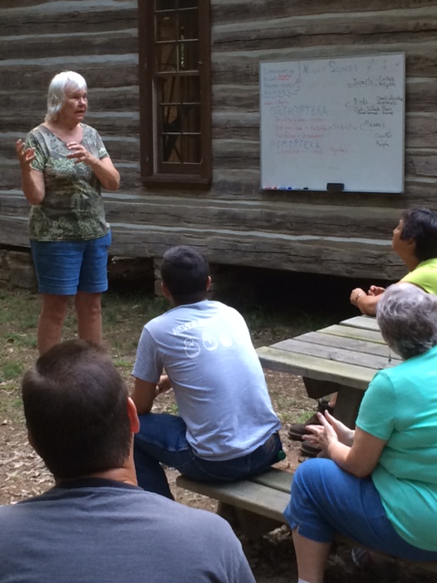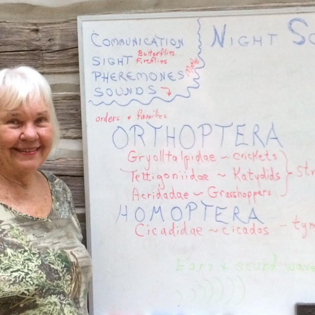 After the program, Bob Hartmann led the group in a sunset walk, showing them the milkweed plantings to help the monarch butterfly population and the sawmill operation designed to produce usable fence posts and boards using local timber. While walking, the group heard the Dusk-singing Cicada which gave way at nightfall to loud choruses of Katydids and Crickets, singing slowly due to the cooler temperature.