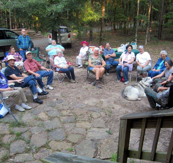 Back at the cabin, Joyce played songs by Almeda Riddle. A nearly full moon provided light, along with the campfire and a lantern. Members enjoyed a potluck and roasted hot dogs and s’mores. The coals were perfect and the fire felt good in the chill of the evening.