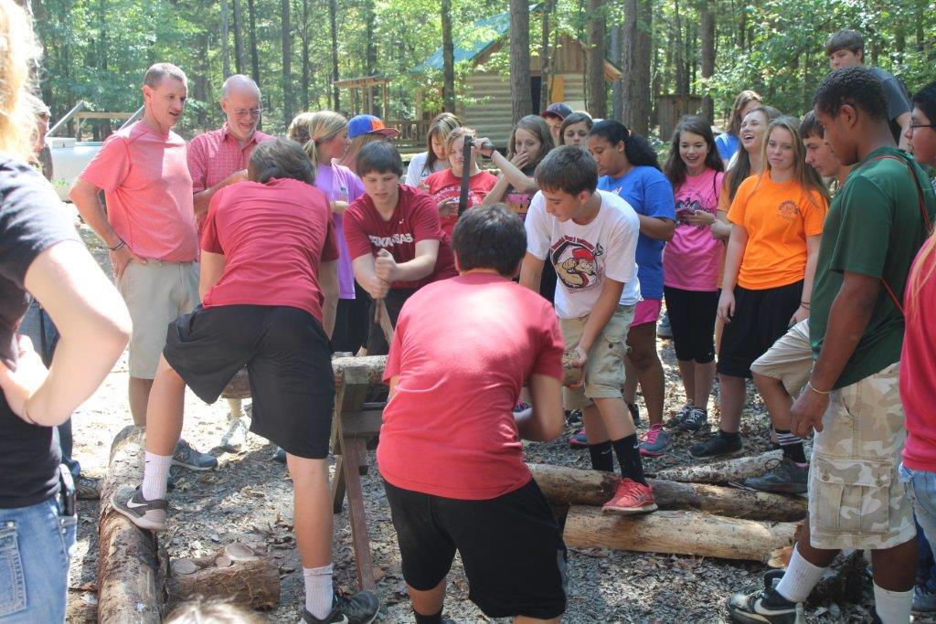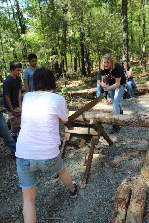 Thirty-nine high school students arrived at the stone entrance of South Fork for the day…Friday, Sept. 18. Scott Perry’s civics class (they were also Jared Brice’s biology students) came to learn about pioneer log cabin life and aspects of ecology they could experience at the nature center. The “nature deficit syndrome” that many students experience was bypassed for the day…interest ran high as lessons in the chemistry of soap making and experience using an old cross-cut saw took the spotlight. Docents led students along the trails studying insects, fungi, and other decomposers that were shaping the ecosystems on the peninsula. Other students seated in a bench circle in the woods reviewed flower parts and their functions as they discussed the sexual and asexual reproductive process influencing the outdoor species of plant life…large colorful trumpet vine flowers (red, orange, and yellow) aided their understanding of the activity.