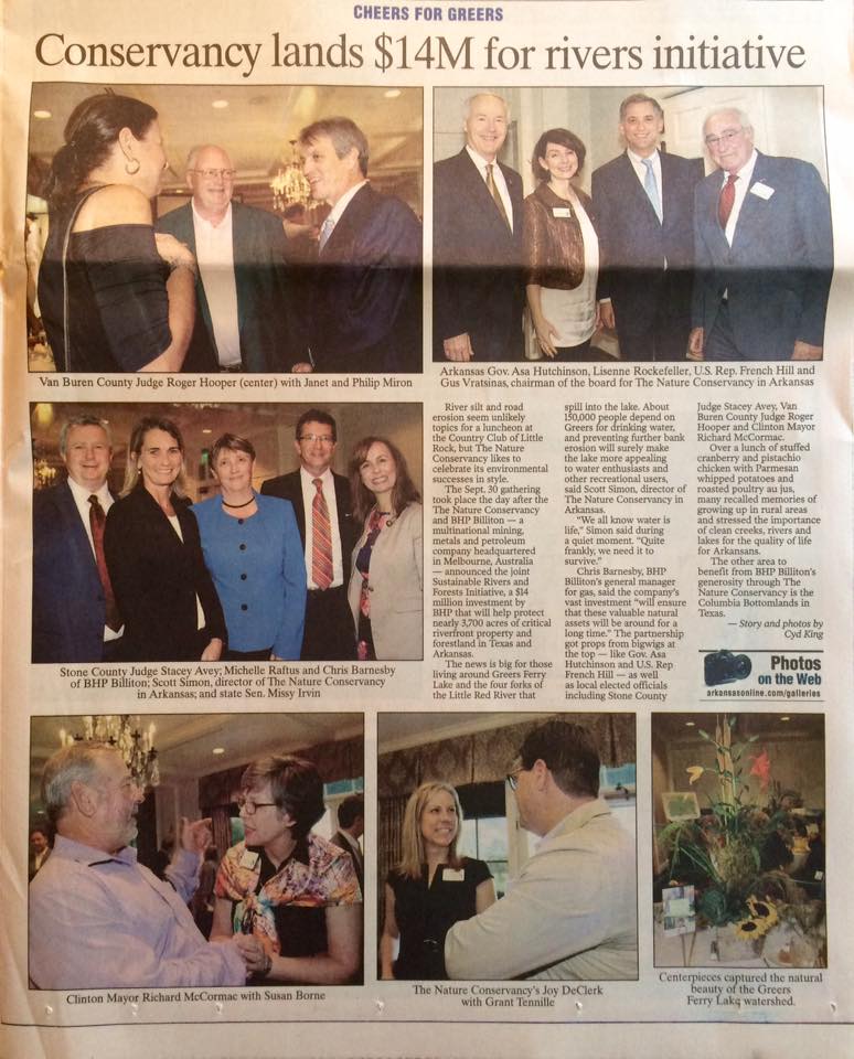 That was the headline of a recent feature in the Arkansas Democrat Gazette, highlighting a Nature Conservancy banquet held in honor of a new partnership with BHP Billiton. Representatives of the Nature Center & the Greers Ferry Lake area were present to commemorate the $14mil conservation grant that will help preserve water quality & habitat in critical areas of Arkansas and Texas. Stay tuned for more exciting news from the hard working Nature Conservancy team!