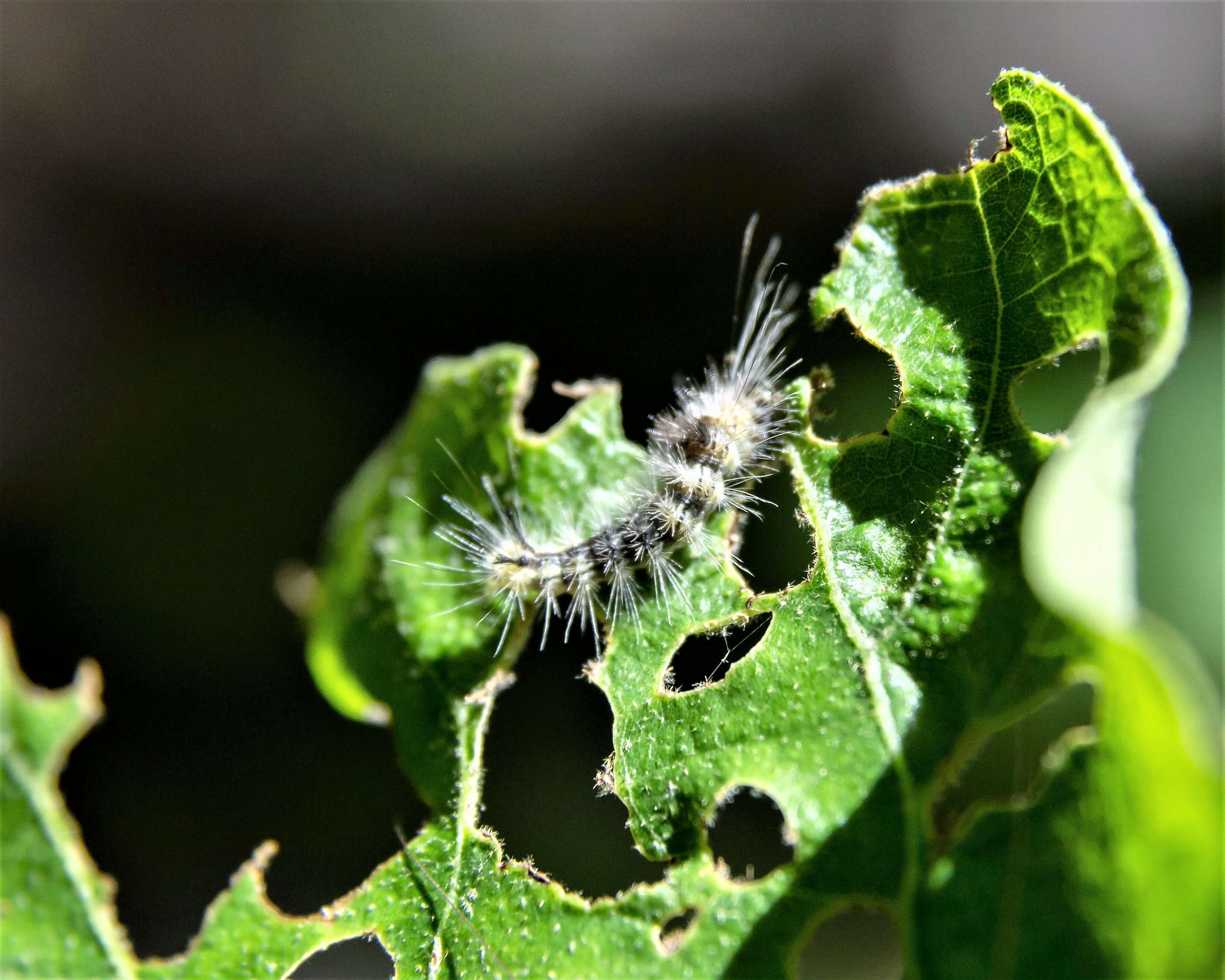 This hairy caterpillar, in moth larval stage, is lunching on an oak leaf and may in turn be lunch for some bird that will sing in the woods as it searches for a mate. -