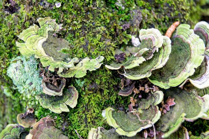 Life on a log. Green algal cells are on the surface of a species of bracket fungus, the fungus having grown from the hyphal threads of the fungi decomposing the log. Brackets are producing spores as a part of the fungus reproduction cycle; all of this is happening on the dead log on which leafy, green mosses thrive rooted among the fungi. -