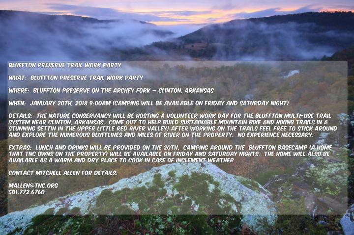 The Nature Conservancy has done phenomenal work in our community to develop the natural beauty of our waterways & trails. Join their team on Saturday, Jan. 20 as a Trail Volunteer! They will be working around the Bluffton Preserve site just north of town. Details included in below. Please contact Mitchell Allen for more information or to sign up at mallen@tnc.org or 501.772.6760.
