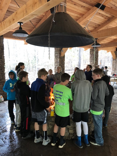 Scott Perry and Jared Brice’s Nemo Vista students (40 of them came on Wednesday, April 25th) set up game cameras in the woods, verifying that the woods are alive and active even after dark. A check for bugs on leaves and twigs or under moist logs yielded exciting results. Shelter in the new outdoor classroom/pavilion was convenient as a few raindrops began to fall, watering the trailside ecosystems. Even the circular fire pit centered under the roof was appreciated when a fire built of nearby cedar warmed kids in the chill of the morning air.