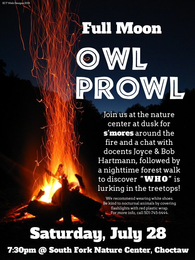 Please join us at South Fork Nature Center on the Saturday evening of July 28th for a unique experience in “Owl Prowling”. Docents Joyce and Bob Hartmann will be hosting the event starting at the new outdoor classroom/pavilion at 7:30. Smores will be shared around the fire pit and Bob Hartman will give a brief talk on the Owls we might find in Arkansas. At dusk, the group will then “prowl” the trails in hopes of spotting some of our resident owls. There should be a full moon that night. If you bring a flashlight, it should have red cellophane wrapped around it. Also, wearing white shoes can make it easier to walk the trails at dusk. This should be an informative, fun evening. We hope to see you there.